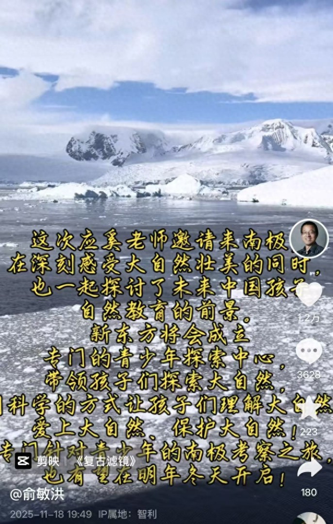 新东方创始人俞敏洪在社交平台发布视频,新东方将会成立专门的青少年探索中心,专门针对青少年的南极考察之旅也有望在明年冬天开启。