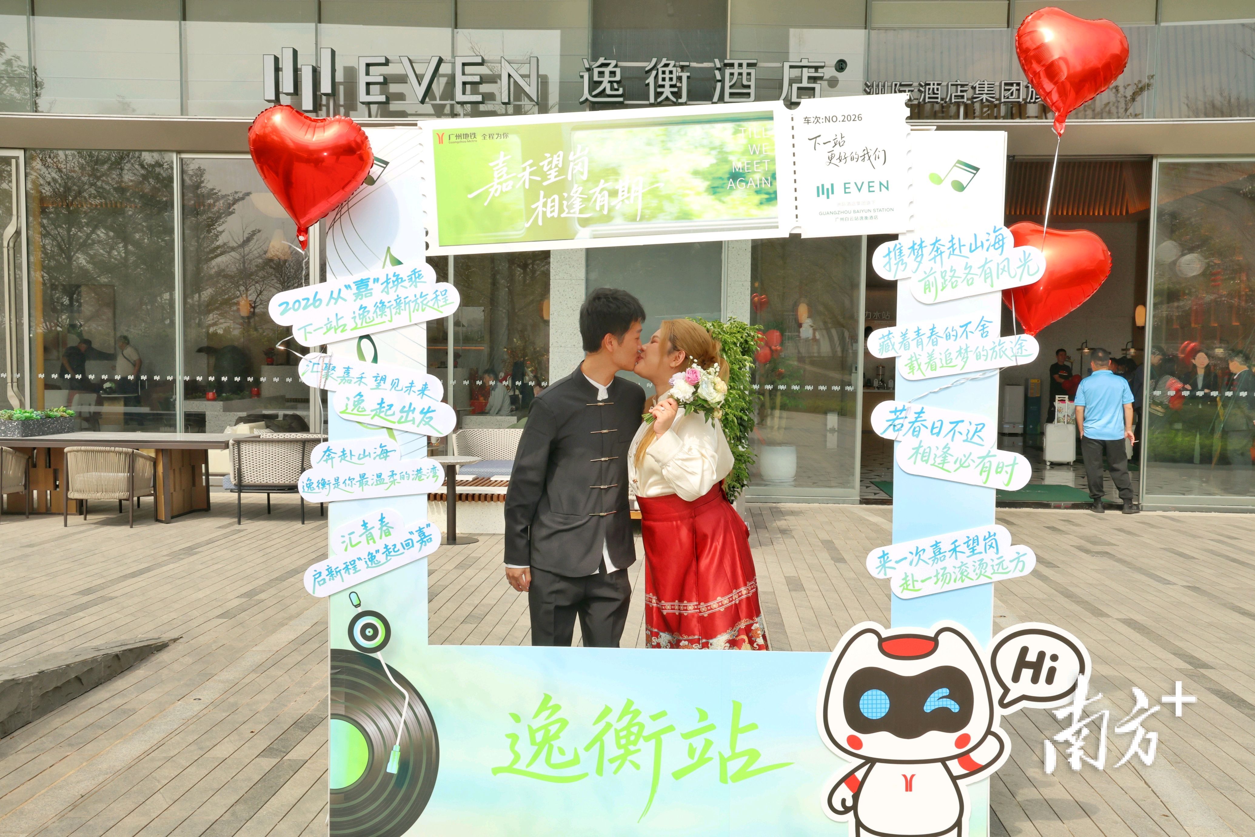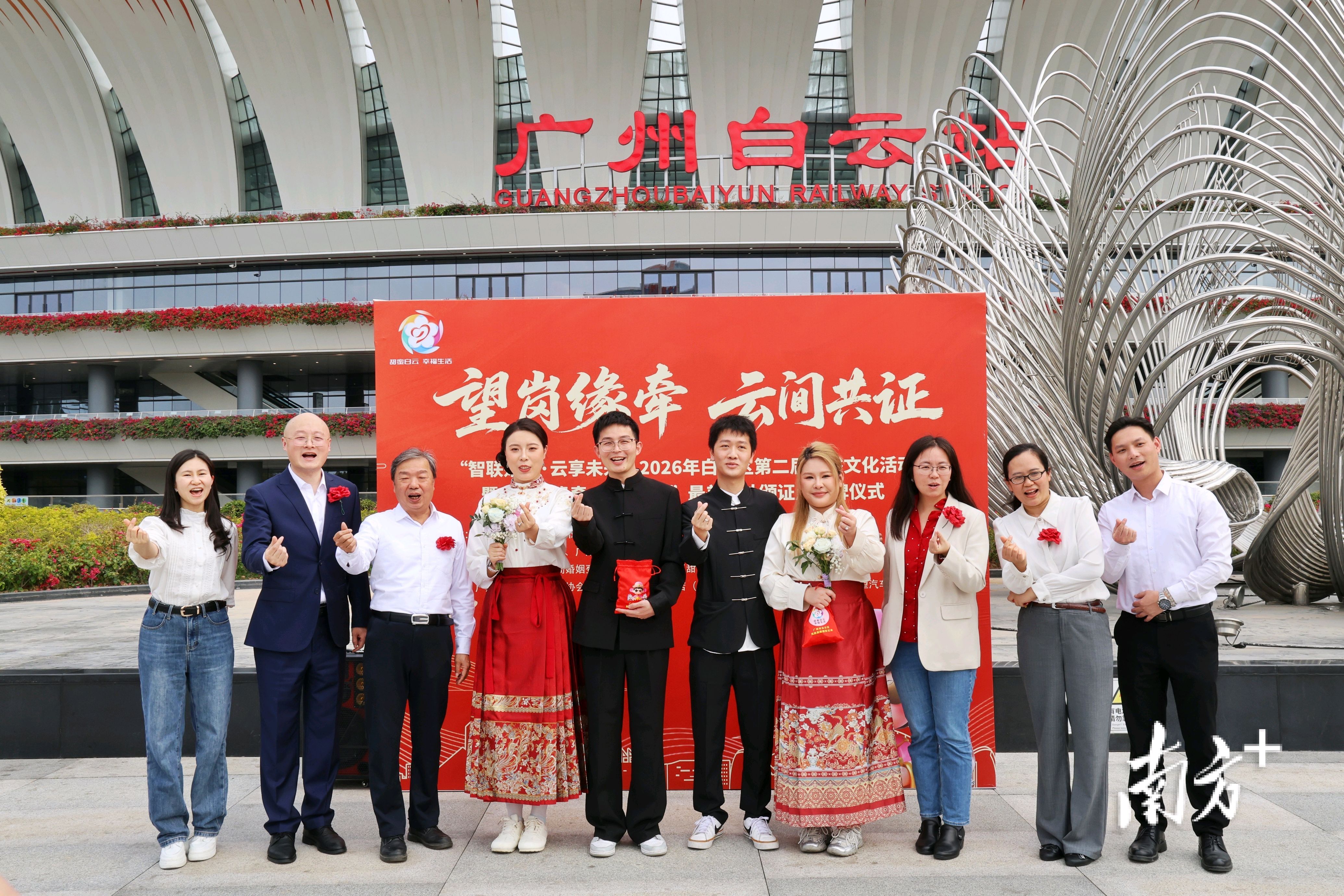 本次活动由白云区民政局、白云区枢纽办等单位联合主办,广州白云站逸衡酒店等单位协办。8对新人分别从情感地标嘉禾望岗地铁站和枢纽新星广州白云站出发,前往白云机场T3航站楼完成“双起点奔赴圆满”之旅。白云区民政局现场向广州白云站逸衡酒店授予“白云区最美结婚登记户外颁证点”牌匾。
