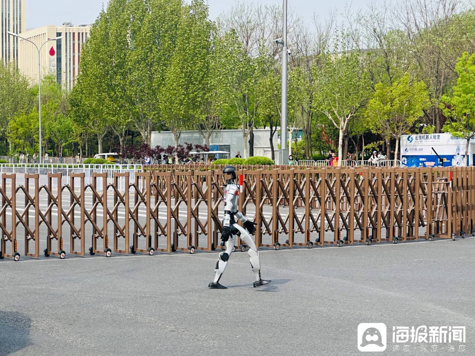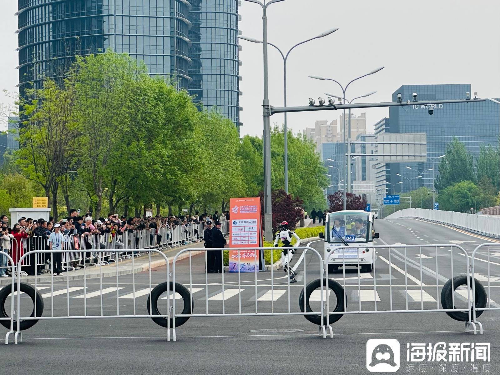 在比赛现场,海报新闻记者最直观感受到的变化是,去年还需工程师贴身“扶着跑”的场景已不复存在,取而代之的是工程师们坐在电瓶车上伴跑,不少机器人的冲刺速度甚至超越了随行保障车。而且,今年跑得快的机器人也比去年多了不少——高的矮的、大的小的,各式各样的机器人在赛道上奔跑自如。曾经需要反复搀扶的“新手”如今已能独自完赛,那些去年还只能蹒跚挪步的小型机器人,今年也迈开小碎步跑得有模有样。赛道两旁,观众的欢呼声此起彼伏,他们不仅为冠军喝彩,也为每一个努力奔跑的“钢铁身影”加油。